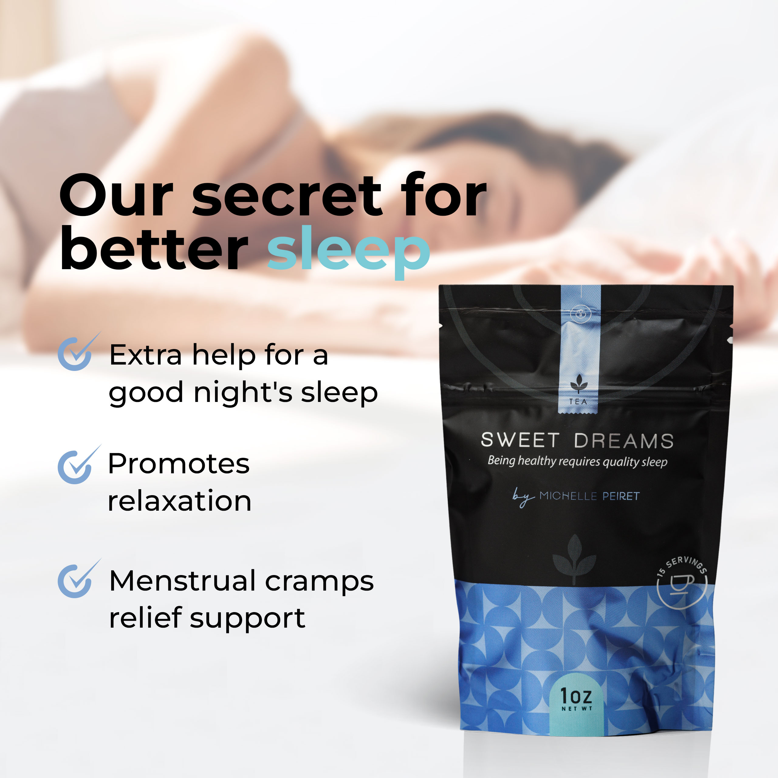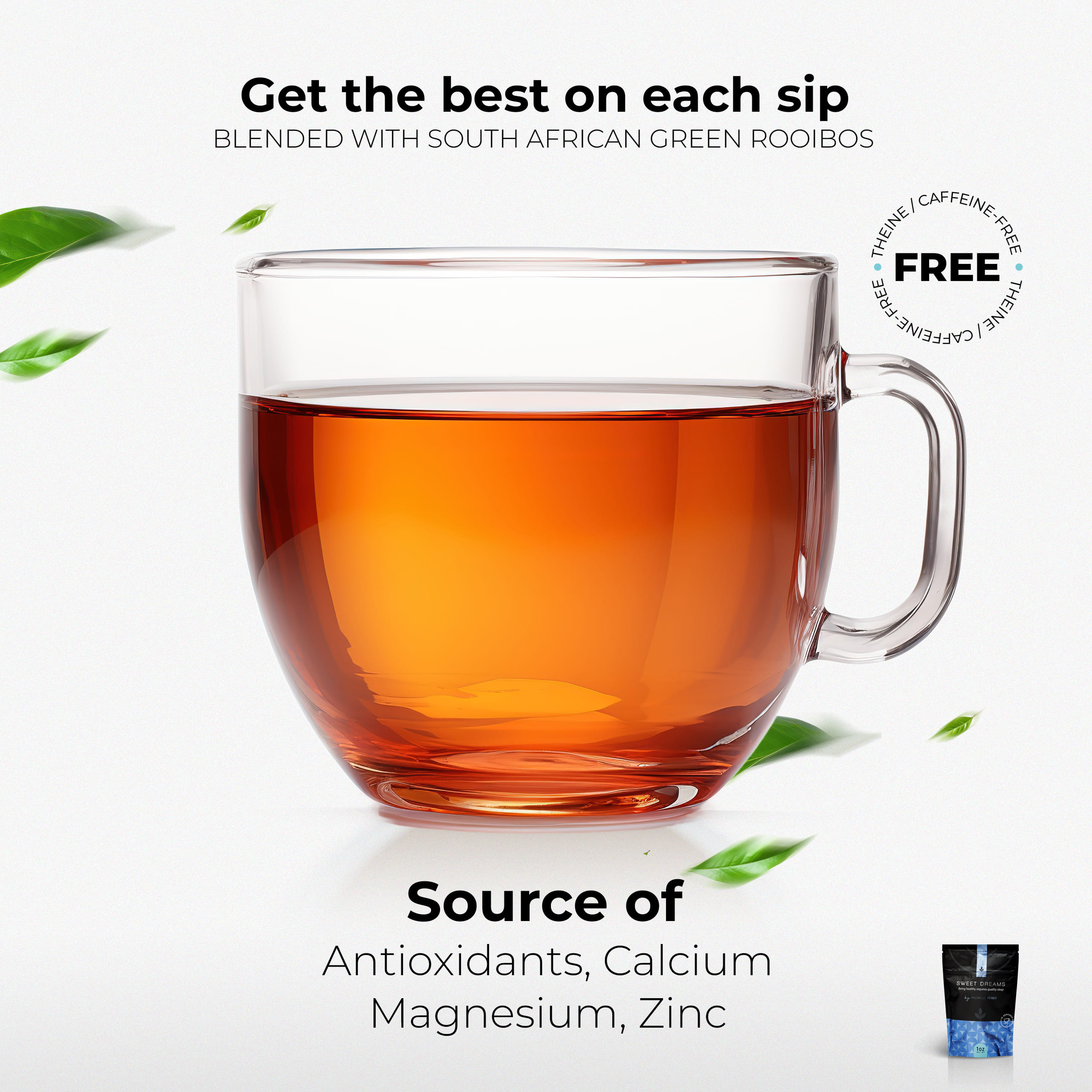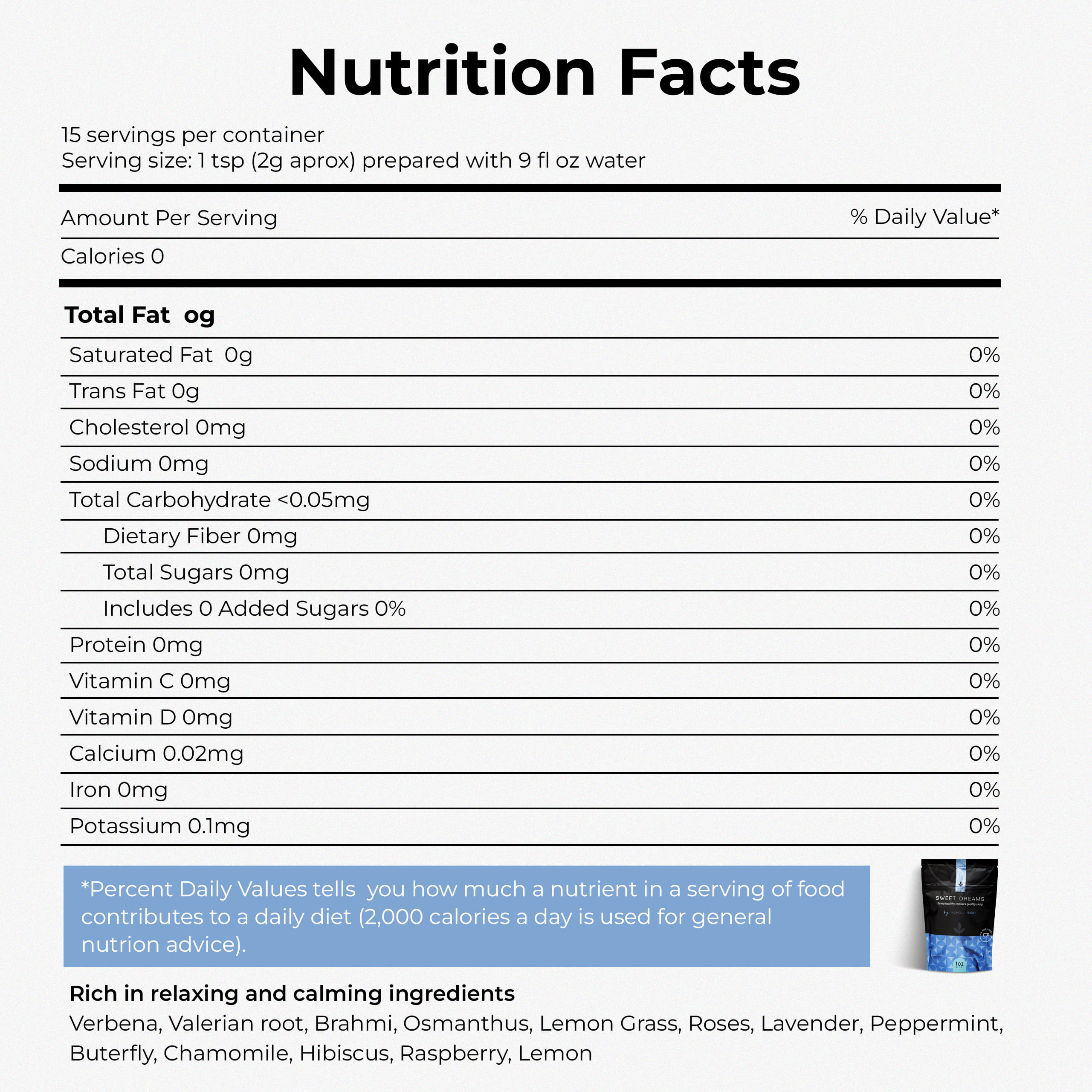 El té Sweet Dreams está diseñado para favorecer un descanso profundo y reparador sin contener teína ni cafeína. Su fórmula combina verbena, raíz de valeriana, brahmi y osmanthus, ingredientes conocidos por inducir el sueño de forma natural y mejorar la calidad del descanso.