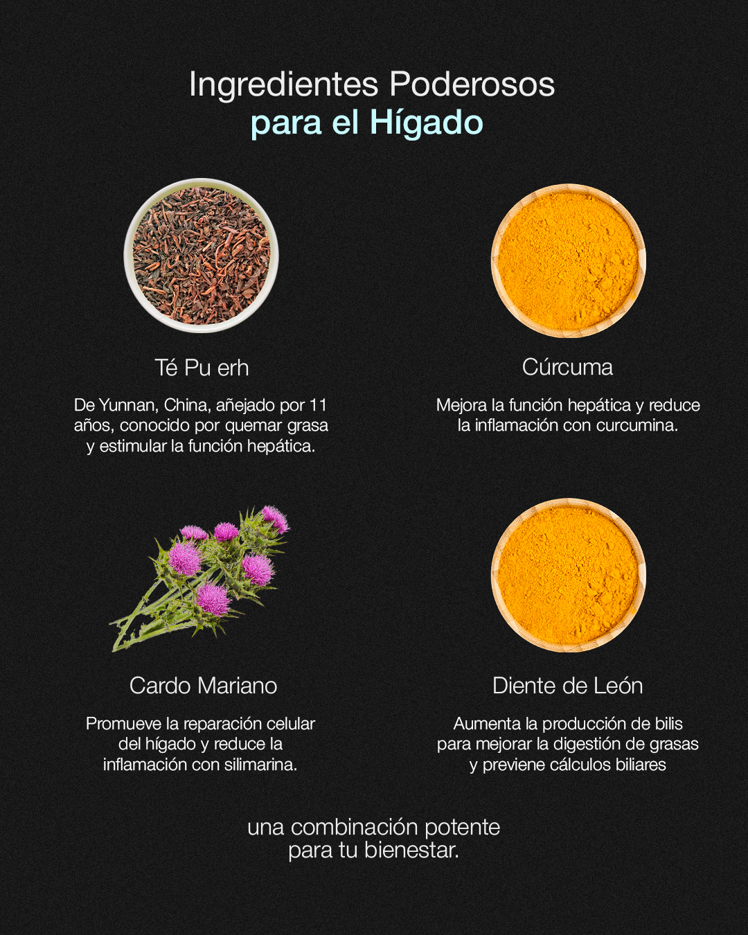 - Desintoxicación y Protección Hepática: Los ingredientes trabajan sinérgicamente para desintoxicar, proteger y mejorar la función hepática, promoviendo la eliminación de toxinas y la regeneración celular del hígado.