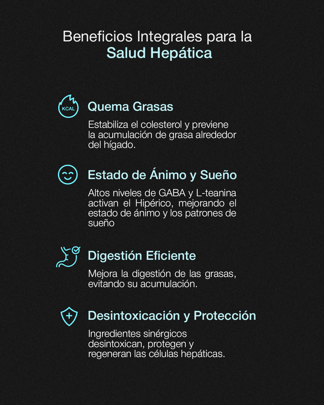- Quemador de Grasa Potente: Ayuda a estabilizar el colesterol y evita la acumulación de grasa alrededor del hígado, estimulando su función natural de procesar la grasa.